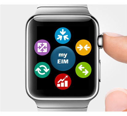 So in the future it may be possible to access our Enterprise Information Management (EIM) suite of solutions, albeit in a very simplified capacity through a wearable device such as the Apple Watch. For arguments sake I will call this ‘myEIM’ to imply that these solutions are being accessed via a wearable device. The icons shown on the screen below represent the key EIM solutions that OpenText offers today, the latest one, through our recent acquisition of Actuate, (highlighted for the purposes of this article by the red icon), is related to analytics.