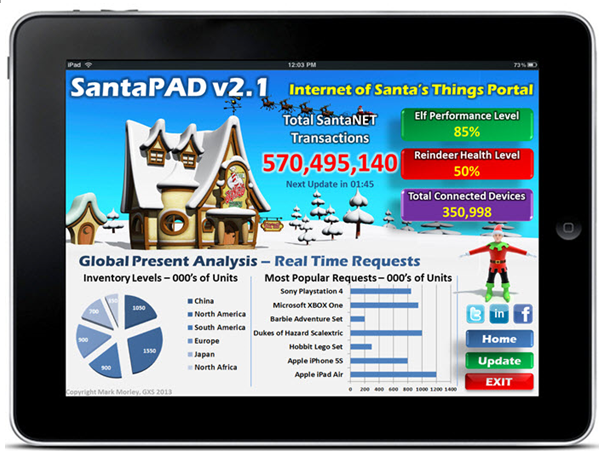 Over the past five years I have written an annual blog on how Santa Claus uses GXS solutions to manage his present delivery network. It may seem a strange thing to try and blog about but as with everything else I had my reasons, namely just before Christmas the IT press tends to run festive themed articles and my blogs have been picked up and re-purposed several times over the years. Not only did I have a great time explaining how Santa’s North Pole operations use every piece of GXS technology but it also gave me the chance to be creative in other ways. For example if Santa needed a mobile app, what would it look like?, how easy would it be to use?, which back end business systems would it hook into etc. OK so an extreme example, but again ‘SantaPad’ shown below is a perfect example of how I apply my creative skills to my every day role.