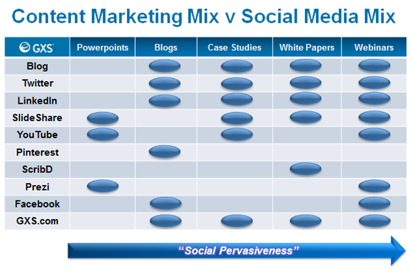 As I mentioned above, I look to try and re-purpose content as much as possible, may be starting with a blog, then developing a webinar or video for YouTube. I produced the following chart to show how different pieces of marketing content can have a different level of ‘social pervasiveness’.