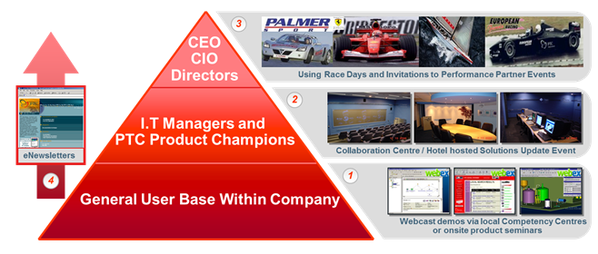 Leveraging the work I did to establish the demonstration centres and manage the Performance Partner program, I then made the transition into a more formal marketing role to help define customer specific marketing plans that could be rolled out against some of PTC’s more important global customers. Each customer specific marketing plan would leverage the full marketing mix and use a combination of collaboration centre events, hospitality via our Performance Partner Motorsport program and leveraging our existing partnerships with the hardware vendors to help co-fund the activities. We developed a three tier approach to target different persona within an organisation.
