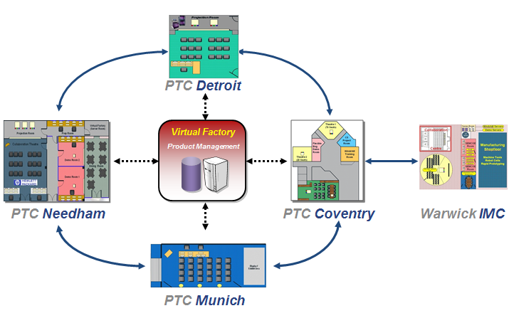 We went on to setup smaller presentation facilities in Munich and Detroit and all the centres were connected to a central ‘Virtual Factory’. The Virtual Factory hosted our demonstration materials on centralised servers and hence with the demonstration data held centrally we were able to run real time, multi-location product demonstrations to simulate how a global manufacturer would operate in the real world. Using the multi-screen facilities we could for example have Warwick on the left screen, Needham on the centre screen and Munich on the right screen. At the time, this was the first demonstration environment of its type to be setup within the PLM industry. The networked centres are shown below, connected to the Virtual Factory which hosted instances of SAP and Oracle as well as the full suite of software from PTC.