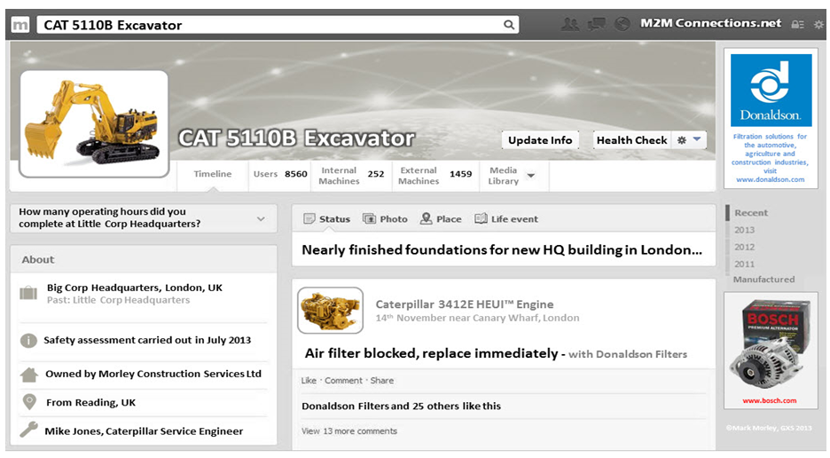 Now what if the engine detects a problem with a blocked air filter. The engine would post a standard message to the profile saying that there is a problem with the filter and it has also tagged the supplier of the filter, namely Donaldson. So the supplier indirectly gets notified of the problem filter and they can then arrange to ship a replacement filter to the location of the excavator, which is also mentioned on the profile. So this is purely a hyperthetical example but just think for a moment about all the information that will come from connected devices or machines in the future, this Big Data will need processing and managing and given social networks are now a part of every day life, why shouldn’t there be a similar network for machines? The blog associated with this concept idea can be found by Clicking Here