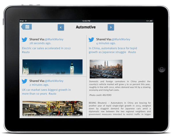 The @GXS app worked perfectly well but has been somewhat hampered by Twitter’s continuous API updates which has slightly affected usage rates. That said the app worked as originally intended and I worked closely with Locassa to develop the app, full credit to the agency as they managed to translate my original specification into a fully working app. As you navigate through each industry section and then into each article you then had the option of sharing the article via social media channels.
