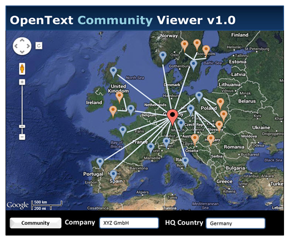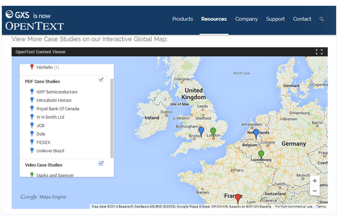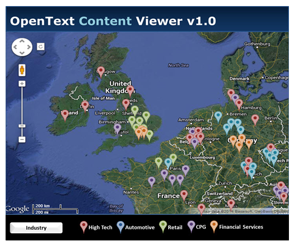 Using the GXS customer billing list it would be possible to assign a pin to each customer based on their office locations and also the industry that they serve. Using the view layer facility within Google Maps you can very quickly filter customers by industry and see which industries are the most popular across each country that GXS serves.