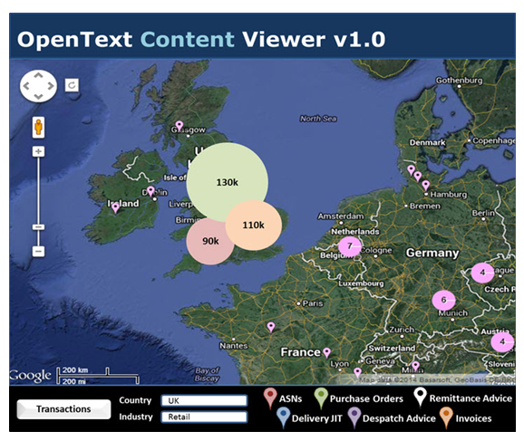 In addition to industry and product based mapping another important area is in the area of trading partner analytics. For example of the 16billion transactions being processed each year how many are e-Invoices, purchase orders or advance shipping notices?. By interfacing with Trading Grid and monitoring the transactions you could quickly determine the volume of transactions flowing, either by message type or per country.