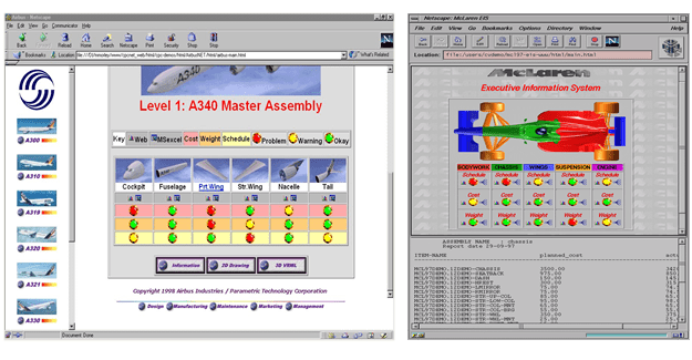 We continued to build out the functionality of our EPD demonstrations and one thing I was keen to do was show the collaborative way in which companies could use the software. In addition I embraced some of our consultancy projects and built these into our demo environments as well. One such example was the Executive Information System, a ‘traffic light’ based solution that helped project teams and senior management to check on the build progress of complex projects. The examples below show an EIS for an Airbus A340 and another for a McLaren Grand Prix car. The EIS shown below is a perfect example of how I embraced this technology in the context of the whole EPD story.