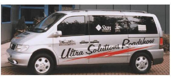 On the back of my relationship with both McLaren and Sun Microsystems I worked on a unique project to try and leverage the McLaren image in a successor to the Discovery Roadshow project from 1995. In 1997 CV was taken over by PTC and one of my last projects at the company in 1999 was to introduce the Ultra Solutions roadshow, a marketing platform that allowed presales engineers to carry Sun Microsystems hardware in the back of a Mercedes MPV. The outside of the MPV was fully branded to reflect the partnership with McLaren and the MPV provided PTC with a high profile way to showcase their partnership with the team.